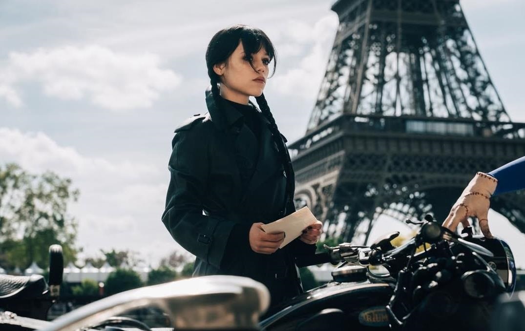 На знімку з’являється головна героїня у виконанні Дженна Ортега. Вона позує біля Ейфелева вежа у Париж, що підтверджує нову локацію подій. Поруч можна побачити і знайомого персонажа – безтілесну руку Річ, одного з ключових героїв родини Аддамсів.
